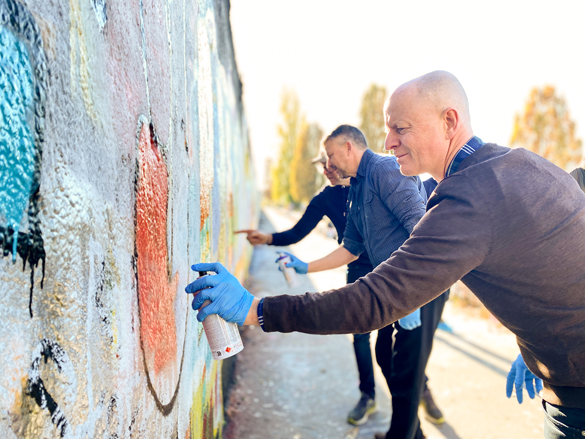 Every workshop begins with an insightful look into the history of the Berlin Wall. Understanding the significance of Mauerpark in Berlin’s history is essential. We use professional-grade low-pressure spray cans, making us the best idea for a team event in Berlin.
